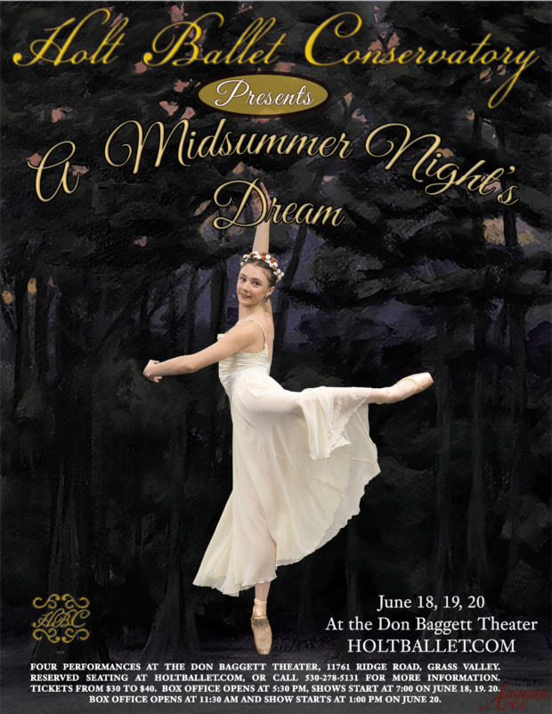 Holt Ballet Conservatory Presents A Midsummer Night’s Dream June 18, 19, and two shows on June 20th, 2026 at the Don Baggett Theater, Grass Valley, California. 11761 Ridge Road, Grass Valley, California. Tickets go on sale April 15 through Eventbrite.